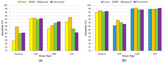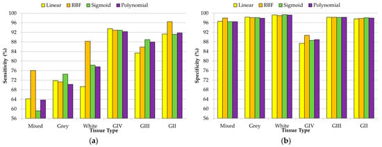 Average specificity (a) and sensitivity (b) results obtained (using the 10 × 5 cross-validation) with the optimal hyperparameters for each kernel type in the DL3 (normal mixed vs. grey matter vs. white matter vs. grade IV vs. grade III vs. grade II).