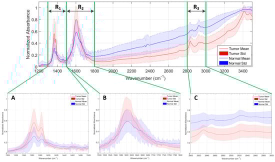 Relevant wavenumber regions selected for the SVM analysis. (A) R1: region from 1300 cm−1 to 1500 cm−1; (B) R2: region from 1500 cm−1 to 1800 cm−1; (C) R3: region from 2800 cm−1 to 3000 cm−1.