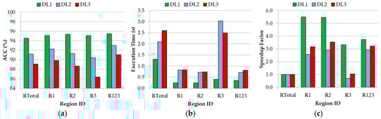 Average of the overall accuracy results (a), execution time (b), and speedup factor (respect to the RTotal execution time) achieved with the SVM RBF kernel with the optimal hyperparameters for each DL, using the different wavenumber regions.