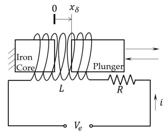 Equation (3) is a first order ordinary differential equation (ODE) of about , indicating that the by measuring the coil current, the inductance of the coil can be solved. And since the plunger’s reciprocating motion creates a variable width air gap, the inductance of the solenoid fluctuates. As a result, the spool’s (same as the plunger’s) displacement can be obtained from the inductance information.