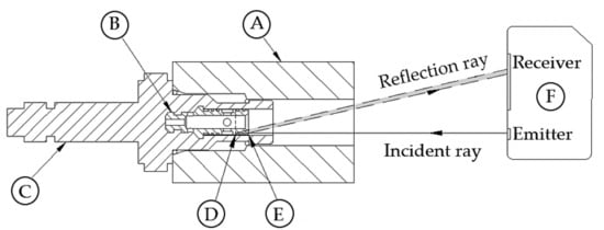 Principle of valve spool displacement measurement: A: Valve manifold; B: Spool; C: Iron core (and plunger, which is not shown); D and E: Spool upper and lower limits of travel; and F: Laser triangulation sensor.