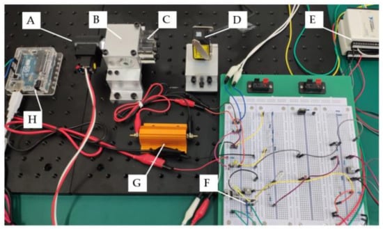 Photo of valve spool optical measurement system: A: Solenoid on–off valve; B: Aluminum valve manifold; C: Acrylic sight window (only installed during oil-immersed experiment); D: Laser triangulation sensor; E and F: Data acquisition and control; G: High-power electrical resistance; H: Micro-controller unit.