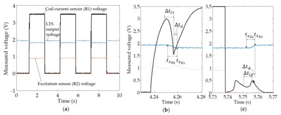Based on the procedures discussed in Section 3.3, the test results of the solenoid valve in continuous on–off switching operation were recorded through the data acquisition system, as shown in Figure 7a. Before the calculation of the solenoid inductance, preprocess of data was performed to obtain the interested sections of spool displacement () and electrical current () data, when the solenoid was transitioning. This was done by locating the starting () and finishing () time stamps in the LTS signal when the valve was transitioning to open (air gap reducing to zero) as in Figure 7b; a selected section of spool displacement signal was . According to the specification of the LTS from the manufacturer (in Table 1), it shows that the processing circuit of the LTS induces a time delay from the measurement to signal output. The measured LTS signal, , shifted to for delay compensation. The respective electrical current signal was selected to be . The sections of data when the valve was transitioning to closed (air gap increasing from zero) can be obtained similarly (i.e., ) as in Figure 7c.
