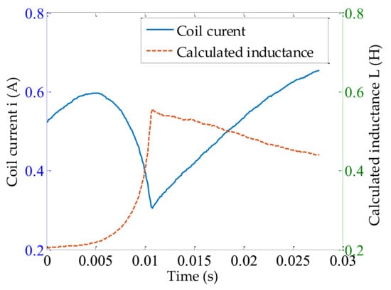 To calculate using the measured coil current in Equation (9), an initial condition of was required, which can be solved using Equation (12) through a grid search. But for the sake of calculation time, a range of search needed to be set. In Section 2.3, it was found that the grid search should be within . Based on the parameters of the on–off solenoid used in Table 2, the lower bound was found to be . Then Equation (12) was solved within , and the calculated initial inductance value was 0.24 H. With an initial condition of , the inductance within can be determined, the calculated when the solenoid was energized is shown in Figure 8.