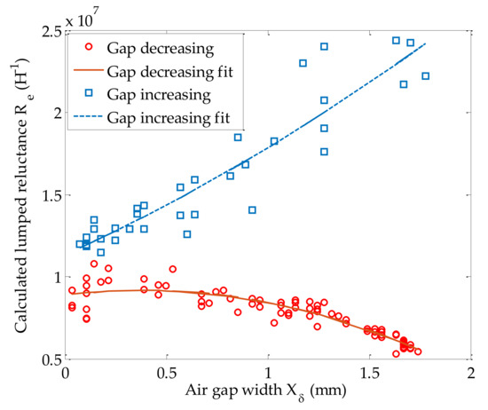 The inverse relationship can be obtained as follows: First, the unknown is solved by substituting the calculated inductance () and the LTS measured air gap width () into Equation (8). Then, by performing a second order least square fit of the calculated to when the air gap is increasing or decreasing, two quadratic equations are found: