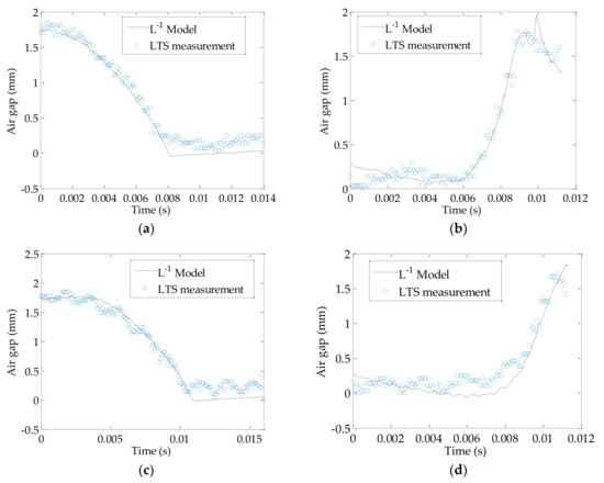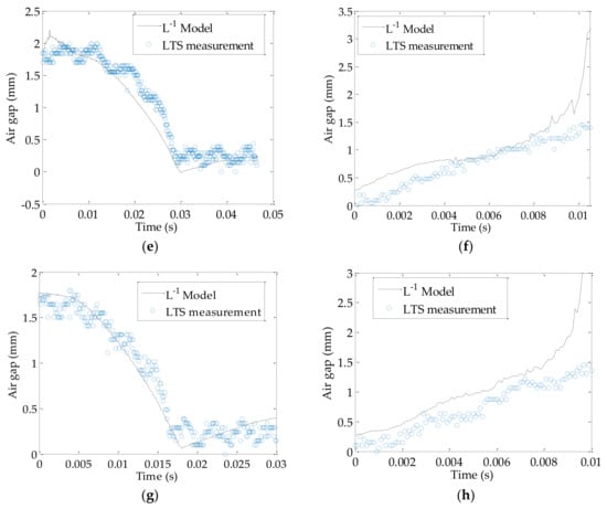 The inductance model (Equation (16)) is tested and compared to the LTS measurement in Figure 10. In the experiment, the model trialed in multiple operating conditions, i.e., the solenoid valve spool lubrication states (open in air or immersed in hydraulic oil) and coil drive current. It is seen that the model compares well with the LTS measurement when the valve is in atmosphere, the predicted air gap width generally lies within the LTS measurement, during the increasing or decreasing of the air gap width, the error is within ±7%. The maximum deviation occurs nears the elbows of the curve, which is at 0.008 s of Figure 10a and 0.01 s of Figure 10b. The deviations are due to the zero-crossing of the time derivative of the current at those locations, which cause significant change in when its magnitude is small. Since is in the denominator in Equation (16), a rapid varying near-zero value would result in fluctuations in results. When the spool is driven under a lower potential as in Figure 10c,d, the model is still able to estimate the air gap width with similar performance, despite more jaggedness in the LTS measurement, caused by the creeping motion of the spool due to lower coil drive potential.