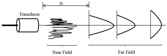 The far field is the area beyond N where the sound field pressure gradually drops to zero. Due to the variations within the near field, it can be difficult to accurately evaluate flaws using amplitude. In the experimental design, the receiver should be placed in the far field. The distance starting from the far field can be calculated by Equation (3), where D is the diameter of the ultrasound transducer and is the wavelength in the transmission medium.