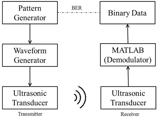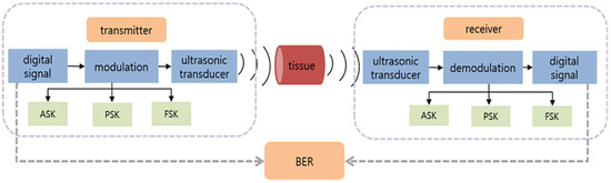 The ultrasonic communication system was designed in two parts. The transmission part includes the signal generator which generates digital signal, modulation, and ultrasonic transducer. Three principal digital communication modulation schemes were used in the experiments: amplitude shift keying (ASK), frequency shift keying (FSK), and phase shift keying (PSK). In this study, only binary modulation was considered. Binary ASK is in the term of on-off keying (OOK). The receiver part included the ultrasonic transducer as the receiver. The digital signal was modulated and then sent to the ultrasonic transducer. The received ultrasound signal was demodulated to the original digital signal. Finally, the bit error rate (BER) was calculated for evaluation of the three modulation methods. Figure 2 shows the architecture of the ultrasonic communication for BSNs.