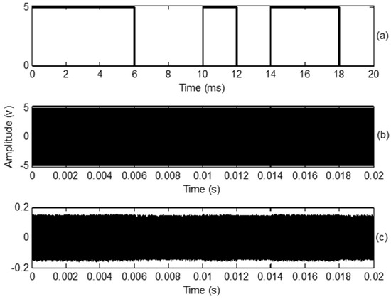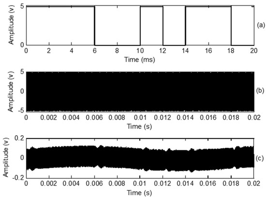 (a) Simulation of on-off keying (OOK) signals with 40 kHz carrier frequencies; (b) Transmitted OOK signal; (c) Received OOK signal in air environment.