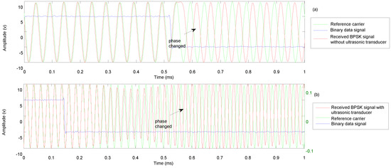 Figure 6 shows the baseband digital signal along with the transmitted and received BPSK signals. The carrier frequency was chosen as 40 kHz. A 180° phase change was imposed when the symbol changed from 1 to 0 or 0 to 1. As shown in Figure 6c, there was a small “bump” when the symbol changed. The shape of the received BPSK signal was sinusoidal. Figure 7 is an enlargement of the 1 to 0 transition in the transmitted (Figure 7a) and received signals (Figure 7b). It can be seen that the phase of the transmitted signal rapidly changes with the digital signal. The received signal is obtained after the transmitted signal passes through the propagation medium and both ultrasonic transducers. In Figure 7b, it can be seen that the received signal remains in-phase with the reference carrier for some time, and the phase then changes along with an amplitude reduction. Finally, the amplitude recovers when a phase change of 180° is achieved. This causes the “bump” in the received signal.