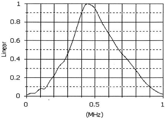 Two discrete frequencies are required for BFSK. According to our survey, almost all commercial ultrasonic transducers have a narrow bandwidth; empirical tests had to be carried out to obtain the same amplitude at different frequencies. We used 500 kHz central frequency ultrasonic transducers (Olympus Immersion Transducer V318) in our experiment. The transducer response to frequency is shown in Figure 8. The test was performed five times and the average voltage was recorded. The amplitude test results are shown in Table 1. The input amplitude is 5 V. The 470 and 490 kHz frequencies have similar amplitudes, as indicated by the bold characters. Finally, 470 and 490 kHz were selected to represent 0 and 1, respectively.