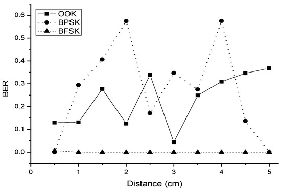 The received signals were demodulated by MATLAB. The demodulation depends on the signal energy, and the threshold value for making decisions for each symbol was set by trial and error. The processing is shown in Figure 10. The BER was calculated in increments of 0.5 cm from 0.5 to 5 cm, as shown in Figure 11. Owing to the data storage limitations of the oscilloscope, the BFSK experiment was limited to a 100 bit stream, and the OOK and BPSK modulation experiments were limited to a 1000 bit stream. Over the three demodulation schemes, BFSK had the lowest BER. This indicates that an ultrasonic wave has better transmission in water than in air. Therefore, we could use the transducer inside the body. The BER for BFSK modulation remains the same as the distance increases. The stability of the BER for BFSK modulation results from the smaller binary stream storage used in the experiment. OOK and BPSK modulation schemes have a small BER for short distances, and then the trend becomes irregular. When ultrasonic waves propagate in air or water, the energy of the received signal is attenuated as the distance increases. Even though the results do not exhibit any increasing trend with distance, the BERs of the three modulation schemes are acceptable.