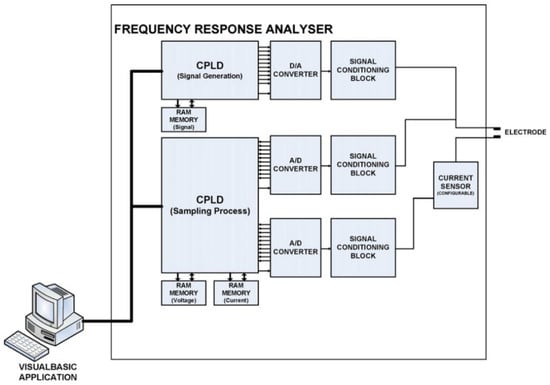 System block diagram of the electrochemical impedance spectroscopy (EIS) device [32]. A/D: analogue-to-digital; D/A: digital-to-analogue.