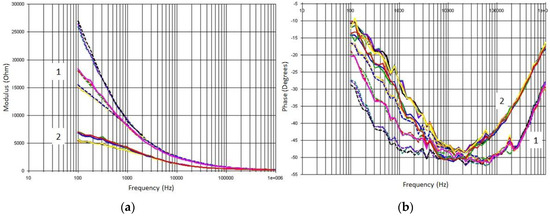 Biplot for both (a) modulus and (b) phase of the obtained EIS raw data for orange No 1 before (1) and after (2) freezing.
