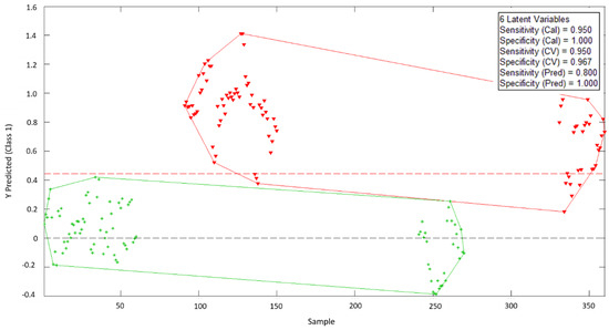 Secondly, a PLS-DA was carried out. The purpose of PLS-DA is to detect significant differences between groups of objects with respect to a set of variables. In fact, it can be considered as a regression analysis with a categorical dependent variable, which can be stated as the label of the group, and a number of continuous independent variables, determining to which groups the samples belong. Therefore, asPCA, it is a classification method. PLS-DA analysis is used to conduct a mathematical description of samples by their distribution in groups and to classify new samples into the previously established groups [34,35].