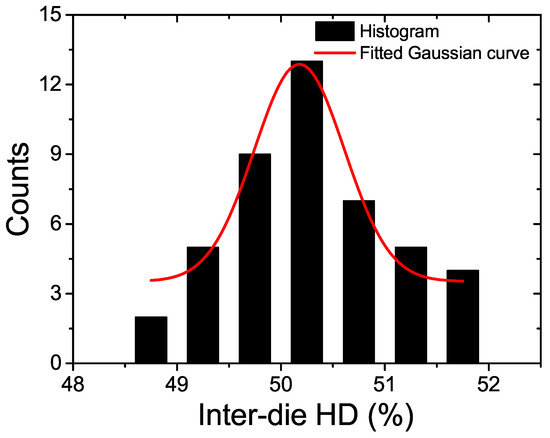 Figure 7 shows the measured frequency distribution of the inter-die Hamming Distance (HD) for 10 PUF dies. The uniqueness measured from the proposed PUF’s inter-die HD is 50.17%, with the ideal value equal to 50%. A Gaussian distribution with mean = 50.17% and standard deviation = 0.43% can well fit this distribution as shown in Figure 7.