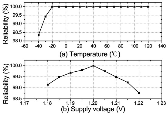 where stands for the bit error rate. With 1000 CRPs produced by the PUF under various temperatures and supply voltages, the reliability is measured. Figure 8a,b show the fabricated RO PUF’s reliability with the temperature and voltage variations, respectively. The worst-case reliability is observed to be 98.30% at −40 C and 1.22 V. The proposed PUF is characterized with a high temperature reliability over a long temperature range. This is because the delay cell we implemented in each RO is the current starved inverter. The oscillation frequency of the RO using the current starved inverter is much less sensitive to the temperature variations [18].