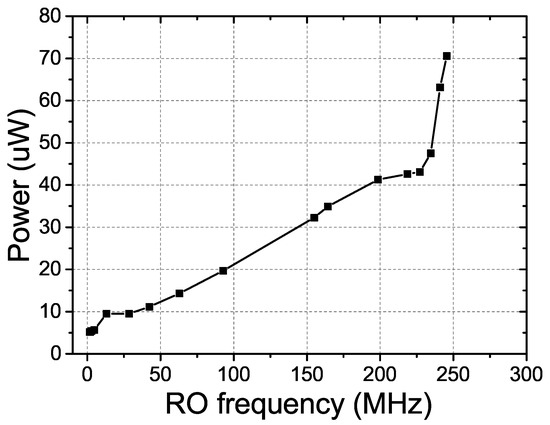 In our proposed RO PUF, the RO’s frequency and the power consumption can be optimized by tuning and of the current starved inverters. Figure 9 presents the measured average power consumption versus the RO’s frequency. It is indicated that the minimum measurable oscillation frequency is 100 KHz and the corresponding power consumption is only 5.16 W. This low power consumption feature is more suitable for the resource-constrained WSN devices working in the distributed area.