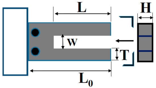 A commercial bare QTF (JU-308, Suzhou Fengguang Electronics Co., Ltd, Suzhou, China) with a nominal resonance frequency of 32.768 kHz at the low mode was selected. The geometric parameters shown in Figure 1 obtained by the average of ten measurement results under an optical microscope (HIScope KH-3000, Hirox, Tokyo, Japan) were the prong thickness T = 0.606 ± 0.006 mm, gap of two prongs W = 0.266 ± 0.003 mm, total length L0 = 6.034 ± 0.023 mm and the prong length and height L = 3.783 ± 0.016 mm and H = 0.354 ± 0.004 mm, respectively. The main structures the QTF are made by the quartz and the attached electrode layer is chromium film.