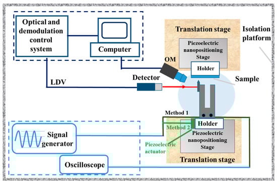 To obtain the basic dynamic parameters (resonance frequency and Q-factor) of the QTF at high mode, we experimentally measured the amplitude-frequency curve based on the equipment in our laboratory, as shown in Figure 2. The system consisted of four parts: QTF-exciting unit, amplitude-frequency measurement unit, a microscope and a displacement control unit. The electrically driven mode (method 1 in Figure 2) or mechanically driven mode (method 2 in Figure 2, piezoelectric actuator (NAC2024, Harbin Core Tomorrow Science and Technology Co., Ltd, Harbin, China) was used as the mechanically exciting source) can be used to excite the sensor suitable for different working conditions. A signal generator (AFG-2225, Gwinstek, Taiwan, China) was used to provide a sweep frequency function for driving the sensor directly or the piezoelectric actuator. The homemade laser Doppler vibrometer system is a laser coherent detection system based on a Mach-Zehnder configuration. It can achieve non-contact amplitude measurement of QTF in real time utilizing Doppler effect when the laser spot is focused on the prong surface of the QTF. The system consists of four parts: a laser, an acousto-optic modulator (AOM), a detector and a demodulation control unit. The basic parameters of the system are: working distance: 5 cm or 20 cm; diameter of laser spot: 8 µm; displacement resolution: 50 pm; the range of frequency measurement: 0–200 kHz; sampling rate: 2 MS/s. The detailed information can be found in references [36,37]. The oscilloscope could display the reverse piezoelectric signal produced by the vibration of the QTF, which could then be used for the situation where the displacement or amplitude of the probe cannot be measured by the optical method. A piezoelectric nanopositioning stage (XP-363, XP-611, Harbin Core Tomorrow Science and Technology Co., LtdXMT, Harbin, China) provided precision translation with a displacement resolution of 0.6 nm under the close-loop control mode. An optical microscope (HIScope KH-3000, Hirox, Tokyo, Japan) with a long work distance objective lens was used to observe and then provide the positions of the probe and samples. In order to achieve the amplitude measurement of QTF, the implementation process is as follows: first, adjusting the distance between the detector of LDV and the surface of QTF prong to make the laser focus on the tested surface. Second, the QTF is excited with a sweeping frequency mode by a piezoelectric actuator and the amplitude of the prong is measured simultaneously by the LDV system in every frequency. Finally, the amplitude-frequency curve is obtained to extract resonance frequency and Q-factor. The typical amplitude-frequency curve of the used QTF are shown in Figure 3 with the resonance frequency of 32.837 kHz and the Q-factor of 10,946 for low mode and the resonance frequency of 188.562 kHz and the Q-factor of 11,080 for high mode. The resonance frequency and Q-factor of QTF used in the calculation were 32.8 ± 0.3 kHz and 11,000.0 ± 400.0 for low mode and 188.5 ± 0.4 kHz and 11,100.0 ± 600.0 for high mode respectively, the results from the average of measuring ten QTFs.