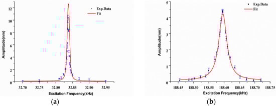 The typical experiment amplitude-frequency curve of the QTF lateral (shear) vibrating at the (a) low mode and (b) high mode.