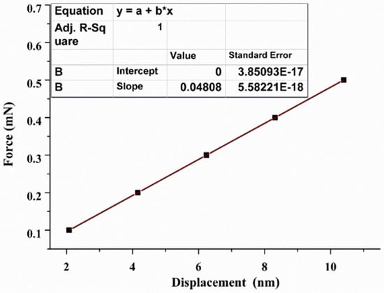 The finite element model of QTF-p was established in Ansys Workbench environment and the geometric and material parameters are selected from Table 1. Owing to the small vibration amplitude of QTF, the linear elastic solid elements were used to model the body of the QTF and automatic grid meshing was employed. The grid meshing was fine enough to ensure the convergence of the calculated results. The base of the QTF (shown in Figure 4a) was adopted as the fixed boundary condition for simulating the actual condition. Two symmetrical bending moments were applied on the end of a prong as the excitation load. The oscillation amplitude of the prong depended on the value of the bending moment. It is worth noting that the electric pad and solder joints were modeled as the actual configuration on the QTF (shown in Figure 4a), which made the model more accurate. The simulation value of the resonance frequency for the QTF was 32.707 kHz at the low mode and 188.446 kHz at high mode with a 0.2% and 0.1% error compared to experiment results. Applying a constant force at the end of one prong, we were able to calculate the spring constant k through fitting of the force-displacement curve (Figure 5) which provided k = 48,077 N/m. Based on the geometrical calculation method [27], the spring constant k of the QTF can be expressed as , where Eq, ρq and f0 are the elastic modulus, density and resonance frequency of the low mode, respectively. Substituting the relevant parameters from Table 1 into the above formula, we obtained the value of the spring constant of 46,809 N/m, which was consistent with the FEM results. In the calculation, the value of the damping coefficient of quartz and chromium was chosen as 7 × 10−6 Ns/m. Owing to QTF oscillating in the atmosphere, additional viscous damping should be considered [38]. Therefore, the value of the constant damping ratio of QTF was selected as 3.9 × 10−5 by referencing the average experimental value of the Q-factor obtained in the harmonic response experiments in the atmosphere, which finally yielded the simulation values of the Q-factor 11,087 (low mode) and 11,193 (high mode), respectively. These calculated and experimental results showed the effectiveness of the numerical model.
