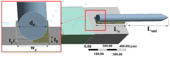 To explore the influence of the probe on the dynamic response of QTF-p at the high mode, the base configuration of the QTF-p is shown in Figure 4a. The linear elastic solid elements were used to model probe and epoxy glue layer. The probe was connected to one prong by the epoxy glue layer, while the shape of the glue was approximated to be rectangular based on the manufacturing method. The interfaces between the glue layer and prong, glue layer and probe were bonded. The mesh density was increased at the connection region between the probe and the prong in Figure 4b. The sketch of the probe connection is shown in Figure 6. The symbols Le, We and te represent the length, width and thickness of the glue layer, respectively. The probe diameter expressed as d0 represents the diameter of the cylindrical part of the probe. Owing to the attachment of the probe, an immersion phenomenon will occur, while the immersion depth is represented by the total height t0 subtracting the glue height te.
