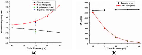 (a) Resonance frequency and (b) Q-factor changing with the increase of the probe diameter for tungsten and the glass fiber probes. The five-pointed star symbols denote experimental results.