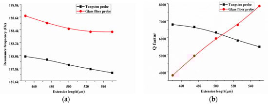 (a) Resonance frequency and (b) Q-factor changing with the increase of the extension length for tungsten and the glass fiber probes.