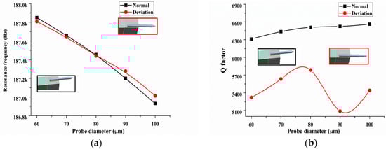 (a) Resonance frequency and (b) Q-factor changes with an increase of the tungsten probe diameters under a deviation of the probe position.