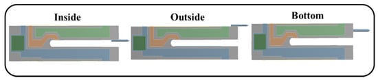 Next, although an outside connection of the probe is widely used [8,18,32], the configurations of the probe inside and the end connected are also used in the application of the QTF-p sensor for different working conditions [17]. In this section, we compare the effects of three kinds of configurations (Figure 10) based on FEM at the high mode and provide some parameters for optimizing design of QTF-p configurations. Figure 11 shows almost the same influences on the dynamic response for the configurations of the inside and outside probe assemblies and the difference for the bottom probe assembly, where such a connection configuration reinforced the structural stiffness and increased the structural damping. Although it is beneficial to maintain the structural symmetry under the bottom type, the structural damping increased. Meanwhile, the bonding strength was reduced in this configuration because the adhesive area was reduced to the size of the cross-sectional area of the probe. Therefore, considering the assembly and practical applications, the outside assembly configuration was the preferred configuration.