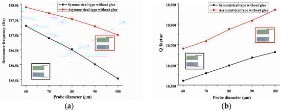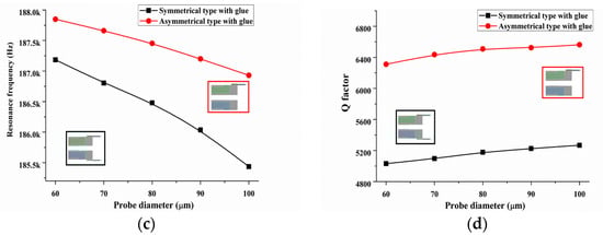 Last, the bare quartz tuning fork possesses excellent dynamic properties owing to its symmetrical structure. Although the probe size is small, its introduction including the glue layer undoubtedly changes the structural symmetrical balance. The breaking symmetrical balance is also a key factor that decreasing sensor’s Q-factor. Thus, it is important to known what factors (breaking of symmetrical balance or additional probe) is primary on the decreasing of Q-factor. In order to keep the structural symmetry of QTF-p sensor, two symmetrical probes were assembled to the outside of the prongs of the QTF, as illustrated in Figure 12. For comparison, one probe with the outside assembly is also shown in Figure 12. First, to eliminate the effect of additional glue on the calculation result, we only discuss the case where the probe was connected with the prong without glue. The FEM calculated results of the resonance frequency and Q-factor with the changes of the diameter of the probe are shown in Figure 12a,b, respectively. We observed that although the symmetrical configuration made the structure balanced, the value of the Q-factor in the symmetrical configuration was smaller than that in the asymmetrical configuration. This result indicated that the increasing of the structural damping owing to the breaking of symmetrical balance was less than that of the self-damping of the probe introduced to the QTF-p structure. Follow, we discuss the actual situation where the probe was connected to the prong with a glue layer, where the parameters of the glue layer were the same as in the first part of this section. The calculated results showed the same trend on the resonance frequency and the Q-factor for both types. The changes in the value of these parameters for the asymmetrical configuration were smaller than those for the symmetrical configuration. For example, the resonance frequencies of the asymmetrical and symmetrical configurations were reduced by approximately 0.5% and 1%, respectively, when the probe diameter was increased from 60 µm to 100 µm. Similarly, the Q-factor was increased by 4% in the asymmetrical configuration and 4.7% for the symmetrical case. Meanwhile, we found that the Q-factor of the symmetrical type was decreased by approximately 20% compared with that of the asymmetrical type. The above results showed that the competition of the symmetry breaking and damping characteristics determine the final dynamic performance of the QTF-p sensor and probe introduction including the glue layer is major factor decreasing the Q-factor. So, symmetrical probes configurations should not be chosen.