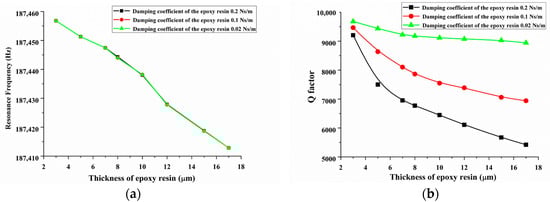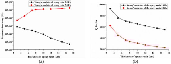 (a) Resonance frequency and (b) Q-factor with an increase of the Young’s modulus and thicknesses of the epoxy layer at the high mode.