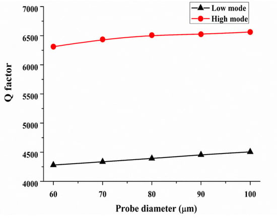 We explored the force sensing differences of the QTF-p at the low and high modes. First, the effect of the probe on the Q-factor calculated by FEM for the two modes are shown in Figure 15. It is worth noting that Q-factors were reduced by 41.5% and 60.4% compared with the bare QTF for the high and low mode, respectively, when the probe diameter was 80 µm. This result shows that the damping property of the QTF-p sensor was less affected by the probe diameter at the high mode.