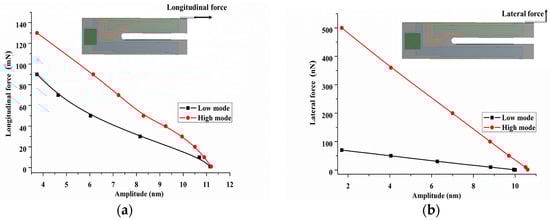 To investigate the force sensing ability of the QTF-p at the low and high modes, we calculated the force sensing range and sensitivity under longitudinal and lateral interactions being exerted at the probe tip. The QTF-p may undergo the two types of loads on probe tip (lateral force and longitudinal force), in which that the meaning of “lateral” and “longitudinal” is defined referencing the axial of prong of QTF-p (refer to Figure 16a,b). Both of two types force can change the dynamics of QTF-p, such as probe amplitude and resonance frequency. For the longitudinal interaction condition, the amplitude of the probe tip was set to 11.2 nm (this value of the amplitude is commonly used in force sensing) under the free vibration for the two modes. Figure 16a shows the change of the probe tip amplitude under the action of the longitudinal force. The amplitude of the probe tip was reduced to 3.7 nm when the longitudinal force was increased to 90 mN for the low mode and the longitudinal force was increased to 130 mN for the high mode. It indicates that a large range of force sensing can be achieved at the high mode for longitudinal force sensing. Similarly, the dynamic characteristic of the QTF-p was calculated under the lateral force loading and the results are shown in Figure 16b, where we selected the viscous interaction as the lateral force, which is proportional to the velocity of the probe moving along the lateral direction. The linear relationship between the lateral force and amplitude is shown for both modes. Examples of the relationship are the amplitude of probe tip decreased from 10 nm to 1.7 nm which led to the increase of the lateral force from zero to 70 nN at the low mode and the tip amplitude decreased to 1.7 nm to make the lateral force increase from zero to 500 nN at the high mode. This corresponded to a force sensing sensitivity of 8.4 nN/nm for the low mode and 59.7 nN/nm for the high mode (refer to Figure 16b). Obviously, with regard to the lateral force sensing, a higher force sensing sensitivity was achieved at the high mode. With regard to the force sensing resolution, if the measurement accuracy of the amplitude of QTF-p can reach 1 nm, the resolution of the force sensing would be 8.4 nN and 59.7 nN, respectively. These results indicate that the QTF-p sensor has a high force sensing sensitivity and a large range of force sensing at the high mode, as well as a high accuracy measurement and a small range of force sensing at the low mode. The difference of sensing range and sensitivity on lateral force (nN order of magnitude) and on longitudinal force (mN order of magnitude) were found owning to lateral stiffness is far smaller than longitudinal stiffness of QTF. In the micro force sensing field, the lateral force sensing plays a decisive role.