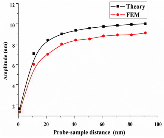 where q(t) is lateral modal response. The M, K, C, F are the principal mass, stiffness, damping and equal exciting force. These parameters can be calculated utilizing the vibration mode shape and other parameters, including geometric dimension, material and dynamic parameters. In this condition, we discuss the dynamic response of the QTF-p under viscous resistance of a water film at the high mode and second symmetrical vibration mode shape was used in theory calculation. The viscous resistance exerted on the probe is , where γ is the coefficient of the viscosity of water is, Ap is the contact area of probe, d is the distance between the tip and the sample and v is the velocity of the probe tip and the value of C is modulated by the viscous resistance. The corresponding parameters and solution process of the Equation (1) can be obtained in reference [24]. The Figure 17 shows the comparison of the approaching curves under a viscous resistance interaction obtained by a numerical calculation and theory analyses. In general, these results were coincident. The reason on the smaller values of the numerical results is that the influences of the electrode and the adhesive layer were taken into account during the calculation.