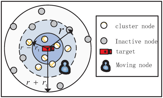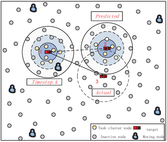 According to the above equation, if , the target could be detected with a probability. In this work, the cluster nodes will be selected considering the predicted position of target, which we will describe later. However, the predicted next position of target is not always very accurate. The nodes that closes to the predicted position of target may detect the target with a high probability at next timestep [24]. Thus, we take into account the distance-to-target of the SNs and ensure the target is detected by the task cluster with a high tracking-probability when selecting the task cluster nodes. Suppose n task cluster nodes track the target, the average of the detection probability of current task cluster nodes to the target is defined as the tracking-probability of current cluster
