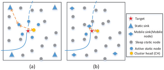 Generally, WSNs consist of many static sensor nodes (SNs) which are tiny low-cost, energy-limited, and sensing range-limited for cost saving. Hence, it is imperative to efficiently manage the sensors’ resources to prolong the lifetime of tracking networks without sacrificing performance. Much research effort has been dedicated to resolve the issue from different perspectives, for example, energy-efficient tracking scheme [7,8,9,10] and energy-balanced tracking scheme [11,12,13]. However, as long as the sensor nodes are static, this issue cannot be fully tackled. In recent years, empowered by embedded computing and wireless communication techniques, some sensor nodes can move around when they are installed on mobile equipments. In general, mobile sensor nodes (MNs) are resource-rich devices with more energy, higher communication power, and more powerful sensing and computational capabilities than SNs [14]. In the hybrid WSNs, SNs are responsible for sensing environment variables, while the MNs, also called mobile sinks, move to designated positions for gathering data or results sent by SNs and then forward them to the remote end. Typically, to support mobility of the MNs, a source node (e.g., a cluster head) can report the target state and other related data to the MNs, and the MNs could move itself to some position according to the target position and then broadcasts its arrival.