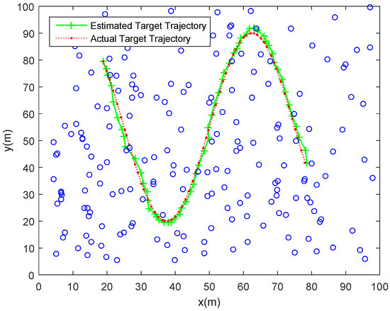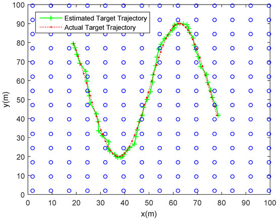 In our simulation, we consider the tracking scenario as shown in Figure 1. A maneuvering target with time-varying speed (e.g., vehicle) moves in a 100 m × 100 m square area with coordinates from to which is covered by SNs and a few MNs. In terms of the target motion, we use a simple linear model to represent the moving target with the discrete time dynamic state equation. More complex models require a priori knowledge, often unavailable in most situations, hence is not considered in this paper [13].