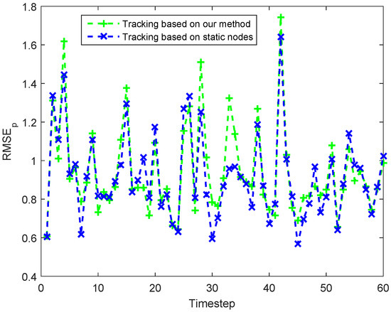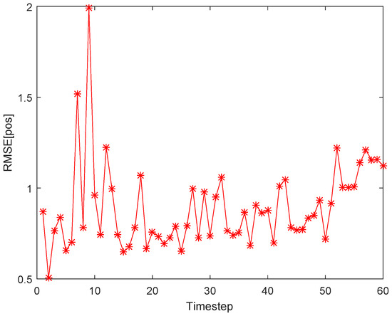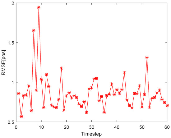 In this paper, the root mean-squared error in position at each timestep, , and its average, , are adopted as the indications of tracking accuracy, since it yields a combined measurement of the bias and variance of a filter estimate [38]. The is given by