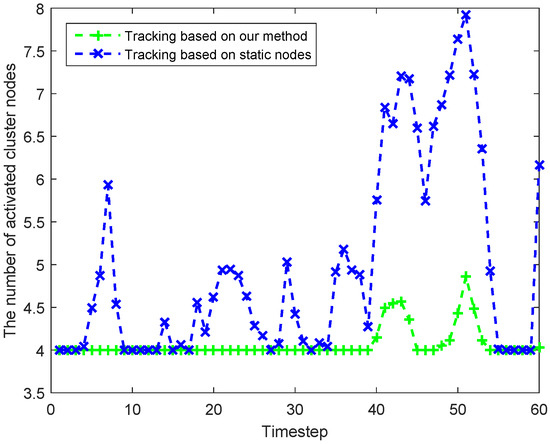 Figure 10 shows the number of activated cluster nodes in each timestep used the two different methods. In this figure, we can see that the number of activated cluster nodes in TSN is greater than or equal to that in THN at each timestep. As for the comparisons of tracking errors, the two methods have nearly the same good performance, which is shown in Figure 11. The of THN and TSN are, respectively, 0.9286 m and 0.9163 m. Therefore, in Figure 10 and Figure 11, we can find that the use of the MNs in target tracking could decrease the number of activated task nodes and then obtain an energy-saving with a good performance in tracking errors.