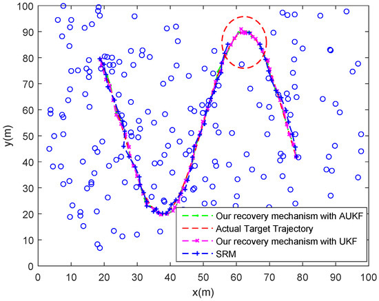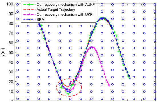 Table 4 also summarizes the averaged activated node amount in one tracking action for recovering the target tracking and the of the three different methods in this case. We can find the proposed recovery mechanism with AUKF achieves the best performance in both two features. Additionally, the performance of the proposed recovery mechanism with UKF is very close to that with AUKF in this case. As for the SRM, the averaged activated node amount of it in one tracking action is far more than that of the previous two, which will consume a great deal of energy. The reason for this is, when the activated neighbour nodes also cannot find the lost target, all nodes in the network will be activated to look into the target according to the theory of SRM.