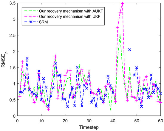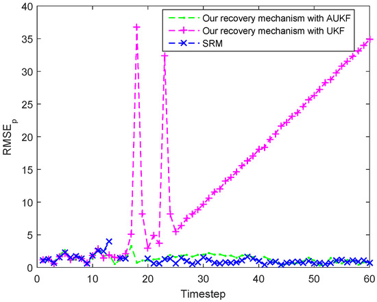 In this section, we will evaluate the performance of our loss recovery mechanism and compare it with the classic source recovery mechanism (SRM) used in work [17]. Readers can refer to work [17] for more details about the source recovery mechanism. Meanwhile, to further illustrate the superiority of the proposed AUKF algorithm in the recovery mechanism, we also compare it with the recovery mechanism with the standard UKF algorithm.