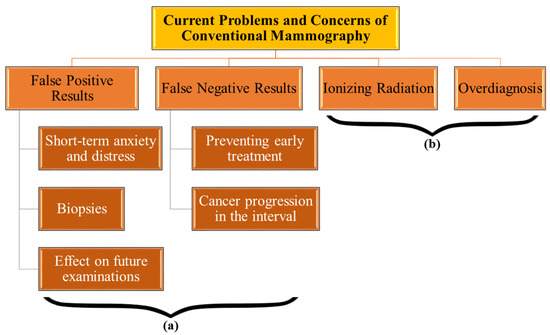 Though mammography has been able to enhance the possibility of early detection of breast cancer; false-positive (FP) and false-negative (FN) results, as well as over-diagnosis have raised some scientifically substantiated concerns (Figure 1). A research study in New England [26] showed a probability of 6.5% of false alarms among all investigated mammograms. This study reported that 23.8% of the participants received at least one false alert, and that the risk of getting an FP could be as high as 43.1% after nine screening sessions [26]. In 2005, Castell and colleagues’ study demonstrated a 10.6% prevalence of false alarm results in women (age range: 50–51) entering a screening program, which was reduced to 3.8% in the second and following sessions. The cumulative risk of the FP results was estimated to be 32.4% in their report, implying that one out of three women in Spain could receive a false alert during 10 biennial mammography [27]. A recent study in 2011 reported that there is a 16.3% possibility of false alarm on the first mammography and 9.6% at the succeeding sessions in the USA [4]. The cumulative probability for a woman to experience an FP, starting at age of 40 (50), was 61.3% (61.3%) and 41.6% (42.0%) with annual and biannual screening, respectively. A patient who is recalled for further assessment must undergo common procedures such as needle biopsy, ultrasound imaging, or perhaps surgical biopsy, before the chance of malignancy is eliminated. Several factors could lead to an FP reading, such as age, family history, number of previous biopsies, current usage of estrogen, and one of the most influential, radiologists’ tendency to interpret a mammogram as abnormal to avoid misdiagnosis [4,27]. The FN probability was estimated to be about 21% in film-screen mammography compared with 16% in computer-aided detection [28]. An earlier study in 1996 reported that between 12.5% and 31.5% of mammograms resulted in FN outcomes, depending on age, follow-up duration, and family history [29]. Current research is mostly concentrated on enhancing the radiologists’ diagnostic threshold, by introducing new methods to make image readings more confident and accurate.