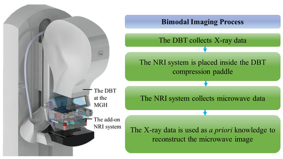 After reviewing the advantages and shortcomings of NRI and X-ray systems, it appears that a dual operating system of microwave and X-ray imaging could leverage the advantages of each approach and simultaneously compensate for some of their individual drawbacks. Two recent studies have evaluated the applicability of this idea by software simulations using fat distribution maps from the DBT [114,115]. This paper is an extension of [116]; and, at hand, it proposes an ultra-wideband NRI mechatronic system (NRIMS) that serves as a complementary scanning machine to the DBT to result in a bimodal hybrid imaging system. The fundamental idea behind the system is as follows (Figure 2): firstly, the DBT scans the breast with X-ray independently and collects the data required to reconstruct the 3D image; sequentially, NRIMS scans the tissue under compression one more time with microwaves (1–3 GHz) in a planar motion over the breast; next, the DBT image is used as a priori information by the microwave imaging algorithm in order to estimate the heterogeneous healthy tissue distribution in the breast. Here, the preliminary results of the NRIMS working in a standalone mode are presented for the sake of assessing its independent performance in a simple experiment. In the proceeding subsections, each part of the NRIMS is described [117,118].