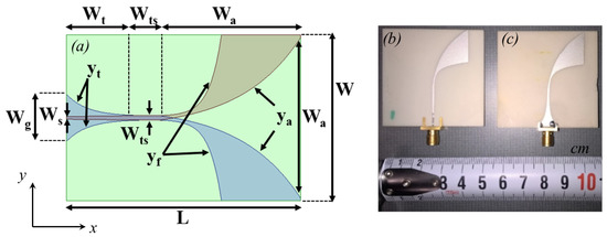 (a) The geometric design parameters of an AVA. The curves denoted by , , and are exponential. This transparent view of the antenna shows the curves on the front and back of the antenna (b) the fabricated antennas, signal side (left), and (c) ground side (right) [121].