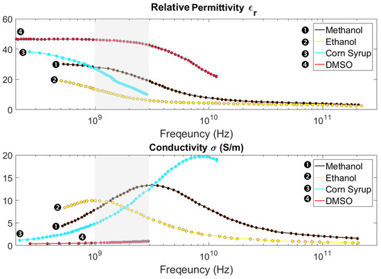Figure 4 illustrates the permittivity and conductivity plots for four different liquids as examples among those that were initially considered. These liquids met some of the criteria mentioned above, yet, eventually three of them were excluded due to high viscosity (corn syrup), higher dielectric constant than antennas’ substrate (DMSO), and possible carcinogenicity (methanol).