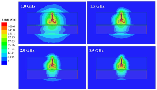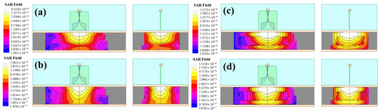 SAR analysis results with 1 g and 10 g samples at 1 GHz and 2.5 GHz: (a) 1 g at 1 GHz, (b) 1 g at 2.5 GHz, (c) 10g at 1 GHz, (d) 10 g at 2.5 GHz. The peak SAR is much smaller than the US (EU) standard, 1.6 W/Kg (2 W/Kg), in all settings.