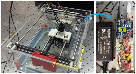 An Arduino UNO board and two Big Easy Drivers were used to actuate the motors. A 12 V/5 A power supply was employed to feed the two motors with an average amperage of 0.6 A (each) under the load, and it was wired via Arduino power jack to the two driver’s power input (Figure 6f–g). To ensure that the box safely contains the coupling liquid, firstly, the bottom segment was sealed with a silicon-based sealant that was specifically designed for plastics (General Electric) and secondly, a lid with hinges was placed over the whole assemblage to constrain ethanol’s evaporation rate. Finally, small holes were made on the lid for the antennas’ cables and electronic wires to pass through.