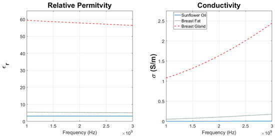 The relative permittivity (left) and conductivity (right) of sunflower oil (solid blue) are close to the behavior of breast fat (dotted green) for the selected frequencies when compared to that of other breast tissues such as fibro-glandular tissue (dashed red) [141,142].